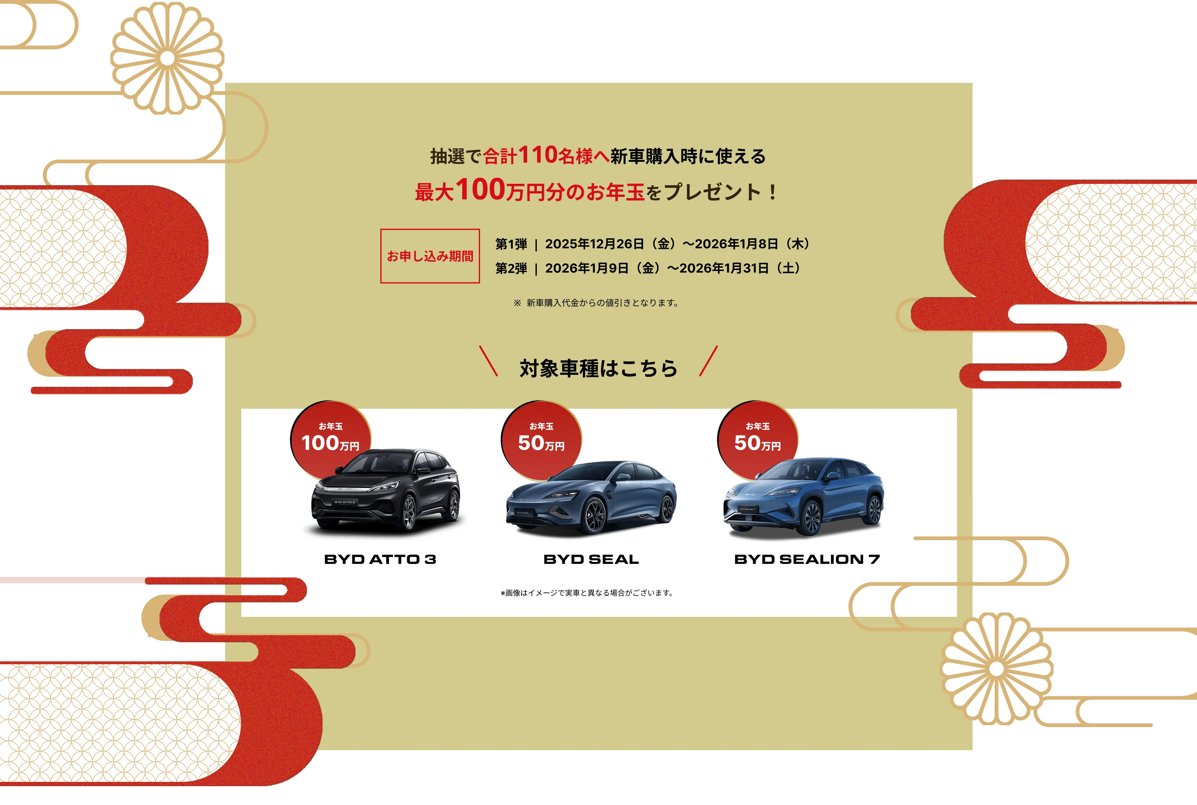 キャンペーンを実施していない店舗もあります。詳細はBYD正規ディーラーへお問い合わせください。