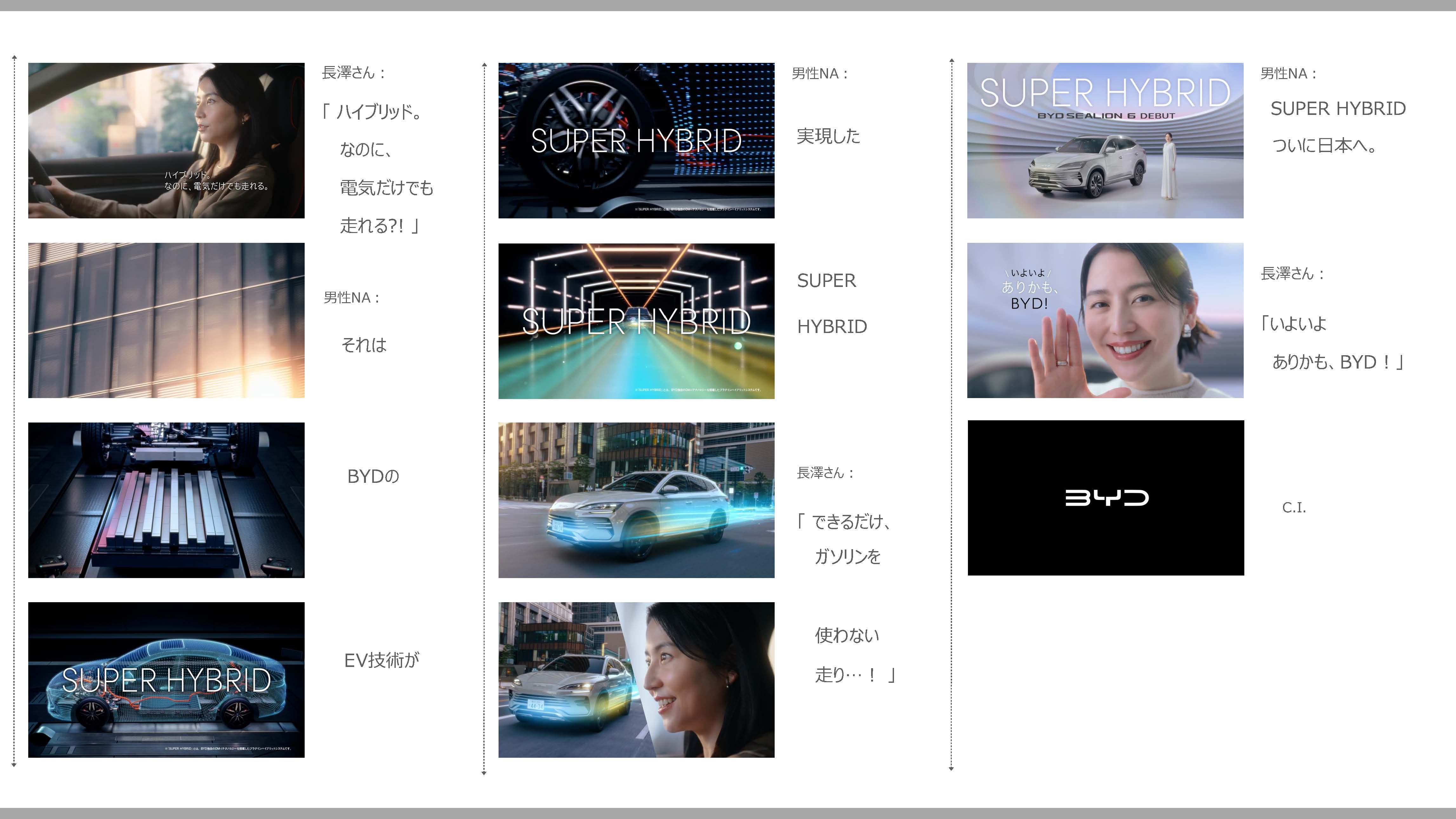 本CMでは、EVの高い技術力をもつBYDが新たに提案する「SUPER HYBRID」という選択肢を通じて、これからの日本のモビリティのあり方を描いています。EVとエンジン、それぞれの強みを融合し、走行状況に応じてクルマ自身が最適な走りを選択するBYDならではの技術とともに、日常の中に自然に溶け込む次世代の走行体験を表現しました。